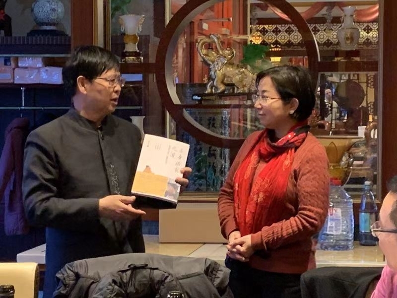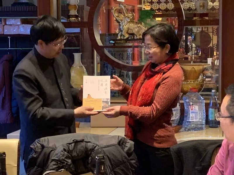 Ein anderer der Delegation ist der 75. Nachkomme von Yanhui (der unmittelbare Schüler von Konfuzius). Er stellte uns seine Kalligrafiewerke vor, die die Essenz der Gespräche oder Analekten von Konfuzius zitieren. Der Delegationsleiter überreichte uns ein satiniertes Buch von Konfuzius-Analekten. Die gesammelten Aussprüche des Konfuzius ist einer der dreizehn Klassiker der kanonischen chinesischen Literatur. Wir bedanken uns recht herzlich für den Besuch und fügen die Werke unserer umfangreichen chinesischen Bibliothek hinzu.